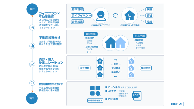 そんな考えに基づき、リッチAIではまずはお客様の投資の目的と現在の状態を確認して、目指す先とのギャップを知った上で将来のシミュレーションや物件探しを行うというサービス設計になっています。