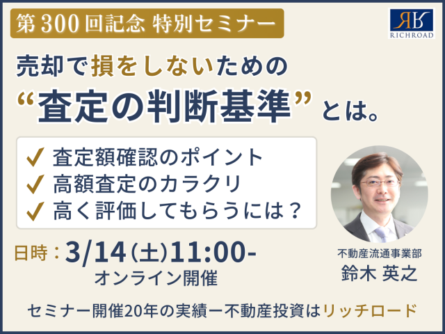 売却で損をしないための「査定の判断基準」を整理。査定価格の根拠や高額査定の見極め方、適正評価を引き出す考え方を実務視点で解説するオンラインセミナーです。